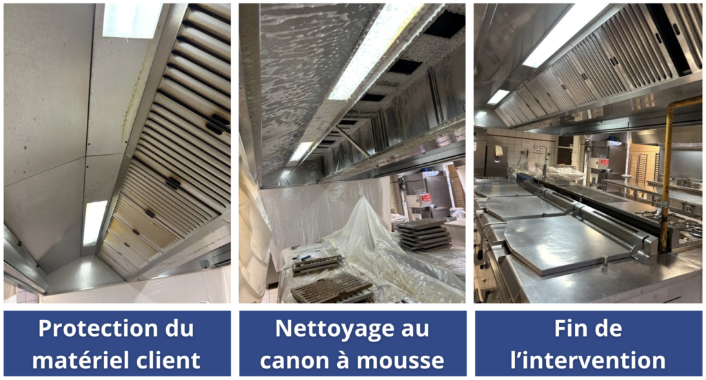 Démontage et nettoyage des filtres et des capteurs de la hotte à l'aide d'un canon à mousse détergente.